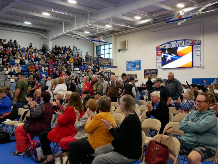 Army veterans stood to be recognized when their song was played during the Recognition of Veterans at the annual Veterans Day breakfast and program held on Friday, November 10 at Boonville High School. Members from each branch of the military were invited to stand when their song was played. (Photo by Laura Wax)