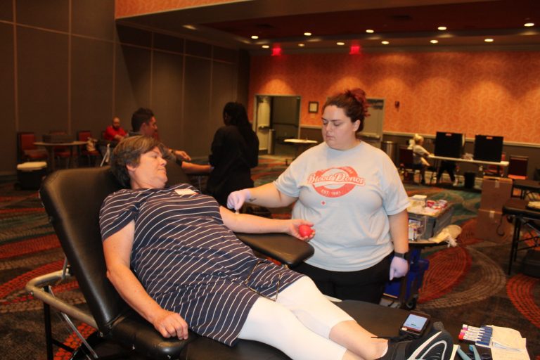 Cutline:Dianna Harmsworth donated blood with assistance by Keirsten McKay on August 14 at the Isle of Capri for the American Red Cross Blood Drive.