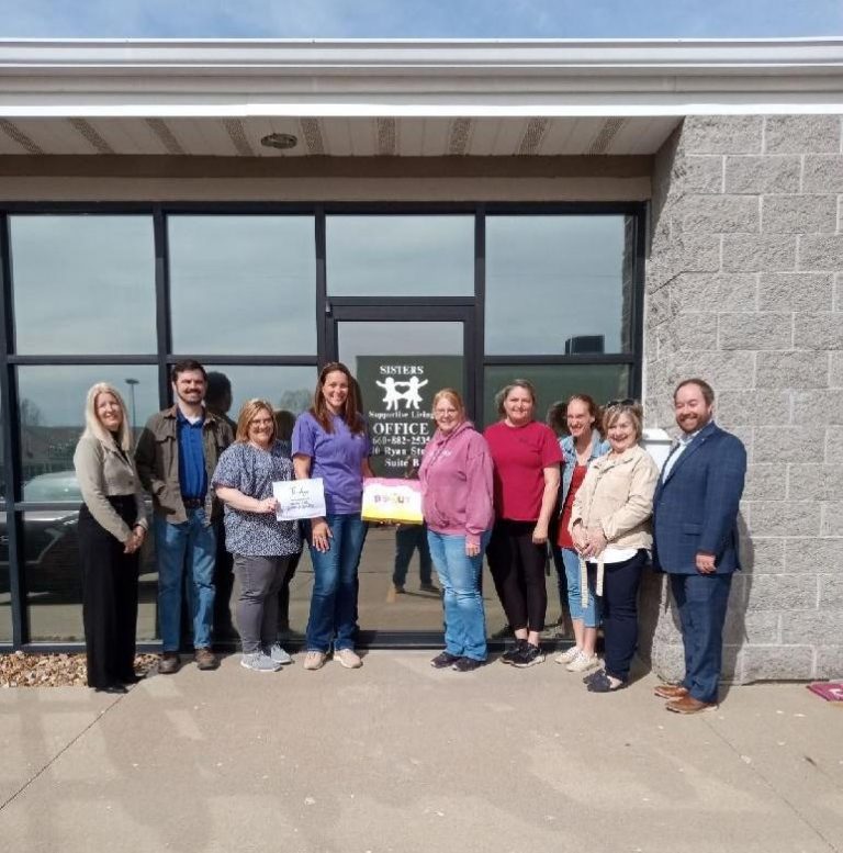 The Boonville Area Chamber of Commerce surprised Sisters Supportive Living employees (in no particular order) Amanda Gibson, Chanda Graves, and Amber Weber with baked goods as a part of the Chamber spotlight program by Chamber ambassadors Gigi Quinlan-McAreavy, Erich Arvidson, Kim Wright, Ashley Friedrich, Susan Lenz, and Scott Pummill. Photo by Elizabeth Davis