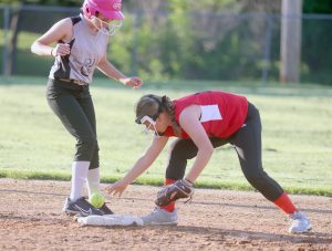 Rt. B Cafe shortstop Cooper Wooldridge catches a fly ball in the second inning Thursday night against Fayette in Midget League action at the Midget League Field. Fayette defeated Rt. B Cafe 3-1.