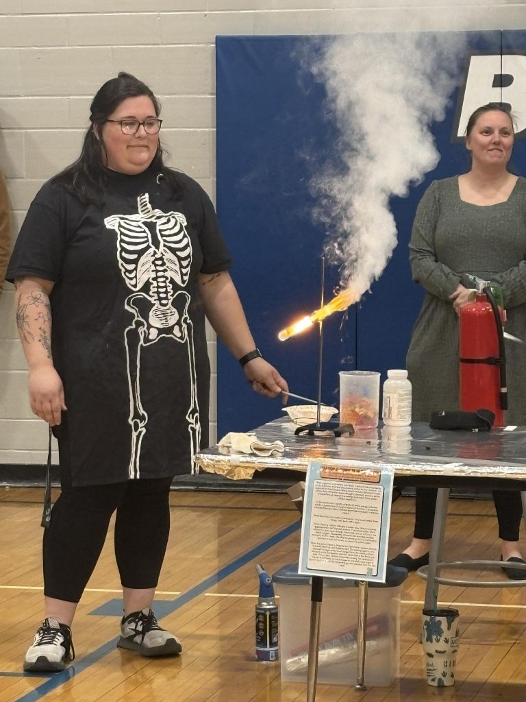 Ms. Lauren Dyer, science teacher at LSE demonstrated an exploding gummy bear during the LSE science night. This demonstrates what happens to sugar when exposed to the environment in a stomach. Photo by Laura Wax