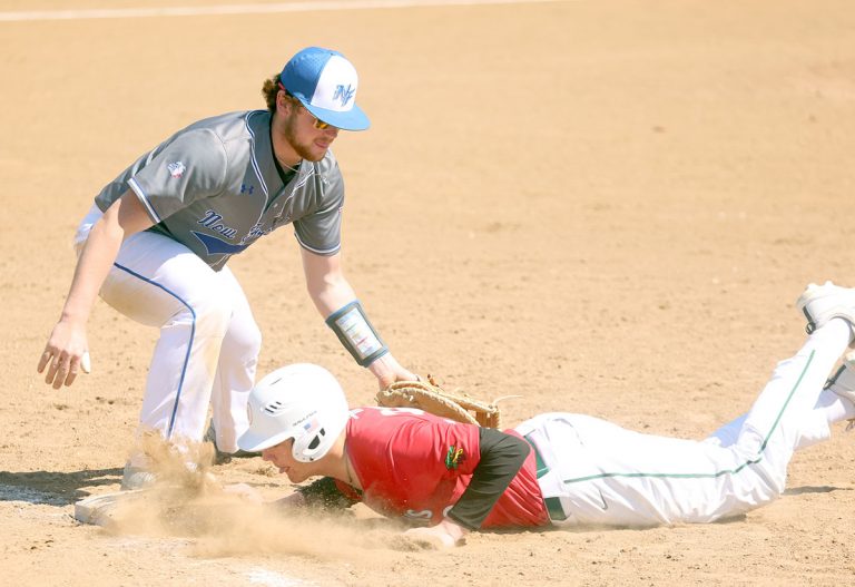 New Franklin first baseman Connor Wilmsmeyer applies the tag on a Mid-Buchanan player during a pick off attempt in the first game Saturday in New Franklin. The Bulldogs beat Mid-Buchanan, who was undefeated going into the game at 8-0, by a score of 11-1 in five innings. New Franklin also won 6-5 over Salisbury in the final game to finish the day at 2-0.