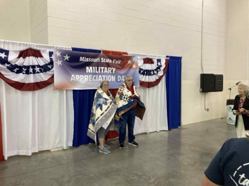 Marty Smith (Prairie Home alum of 1976) of Marshall, MO and his sister Tammy Rhodes (Prairie Home Alum of 1979) of Prairie Home were awarded with quilts from the Quilts of Valor Foundation on Sunday August 10th at the Missouri State Fair.Photo submitted