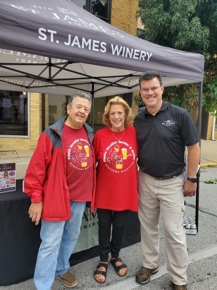 Peter Hofherr (right), owner of St. James Winery, pauses before the crowd arrives to visit with event Co-Chairs Ken Hirlinger (left) and Mary Pat Abele (center). (Photo provided by Mary Pat Abele)